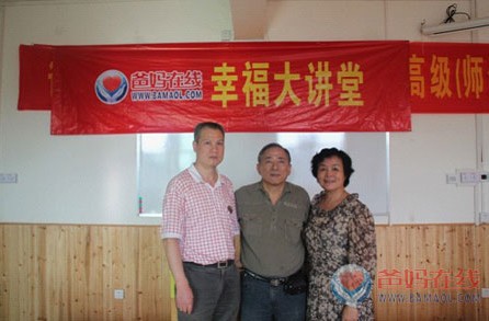 总裁胡煜、总裁高级顾问含笑和严道容先生在总部幸福大讲堂合影