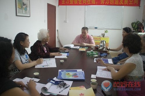 总裁胡煜、副总裁刘宣妤、杨萍、曹娟、总裁办主任刘丽贤和北京红枫妇女心理咨询服务中心创始人王行娟老师在爸妈在线总部会议室座谈