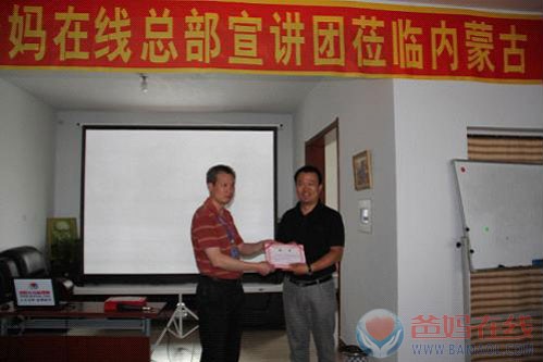 爸妈在线胡煜总裁为爸妈在线内蒙古自治区各级中心领导颁发了任命的聘书。