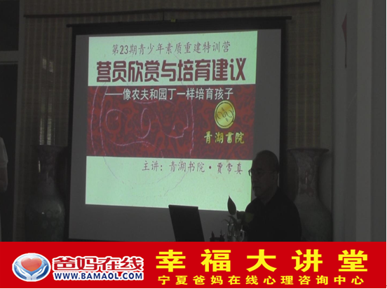 讲座中,针对现在孩子难“管”、难“教”的问题,贾先生与老师、家长们探讨了“我们不懂孩子的原因是什么?”、“如何才能懂孩子?”等一些问题。对教育中普遍存在的家长过于强调自己的标准:随大流,用公用标准衡量孩子;强烈的望女成凤(望子成龙)的愿望;感情在孩子身上寄托太重;不相信孩子成长速度等等现象做了分析和讲解,并教授家长和老师怎样懂孩子,怎样像农夫和园丁一样培育孩子。