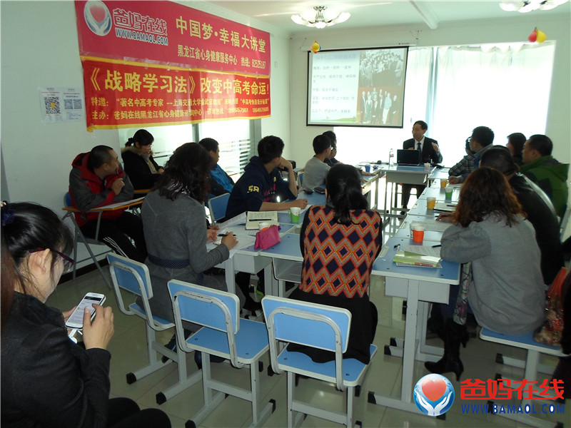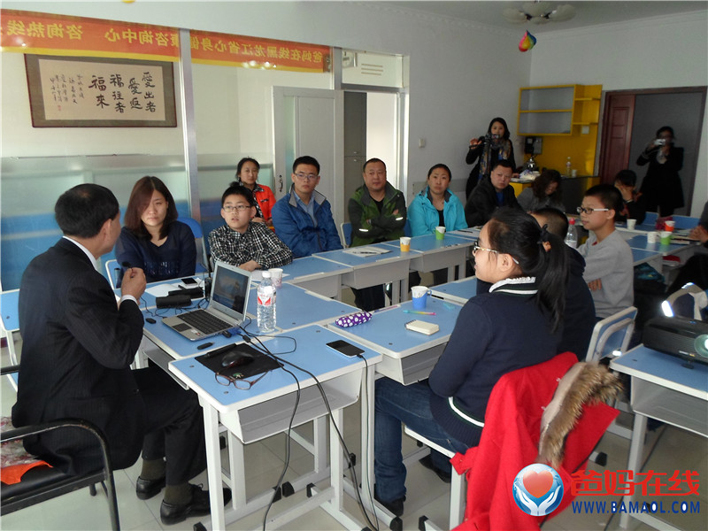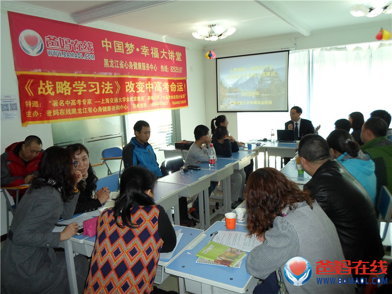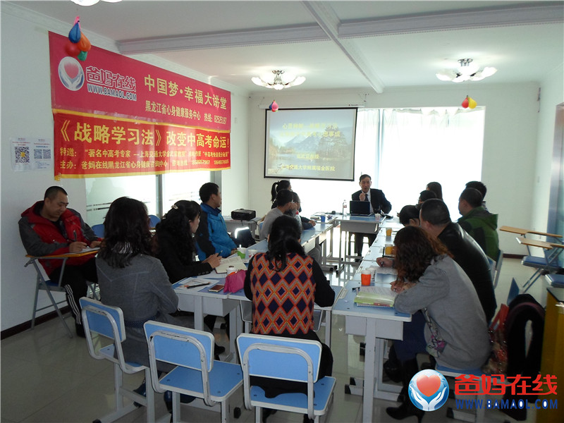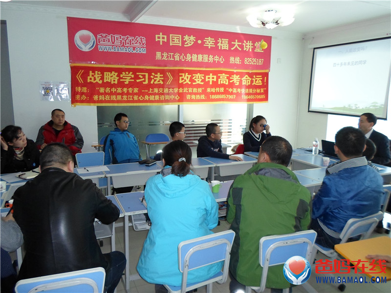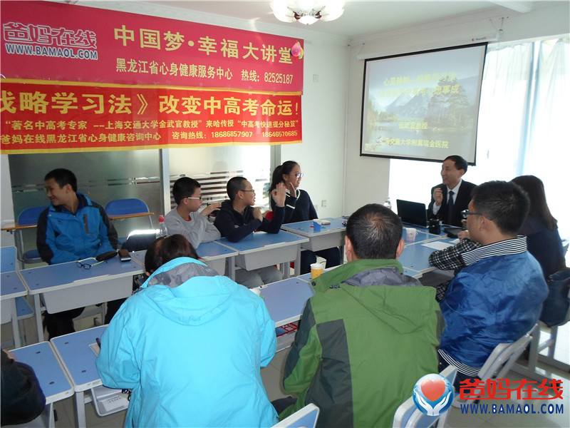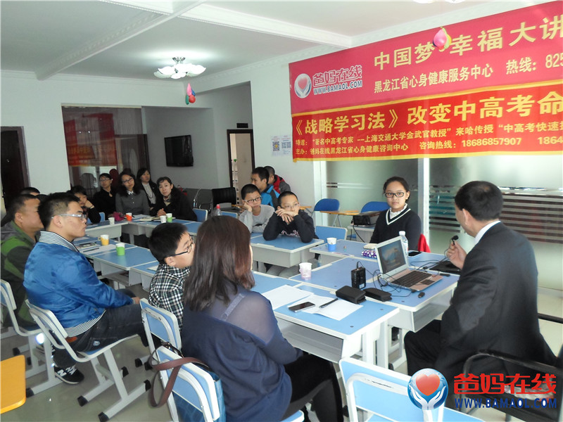 2015年4月12日下午12:30,因今天上午全市举行初中毕业生物、地理结业考试,很多学生和家长未能前来听课,应广大家长的要求,爸妈在线黑龙江省心身健康咨询中心特邀爸妈在线总部心灵讲师团首席专家金武官教授,在省中心的会议室为部分中小学家长和学生举办了第二场主题“《战略学习法》,改变孩子中高考命运!”的公益讲座。