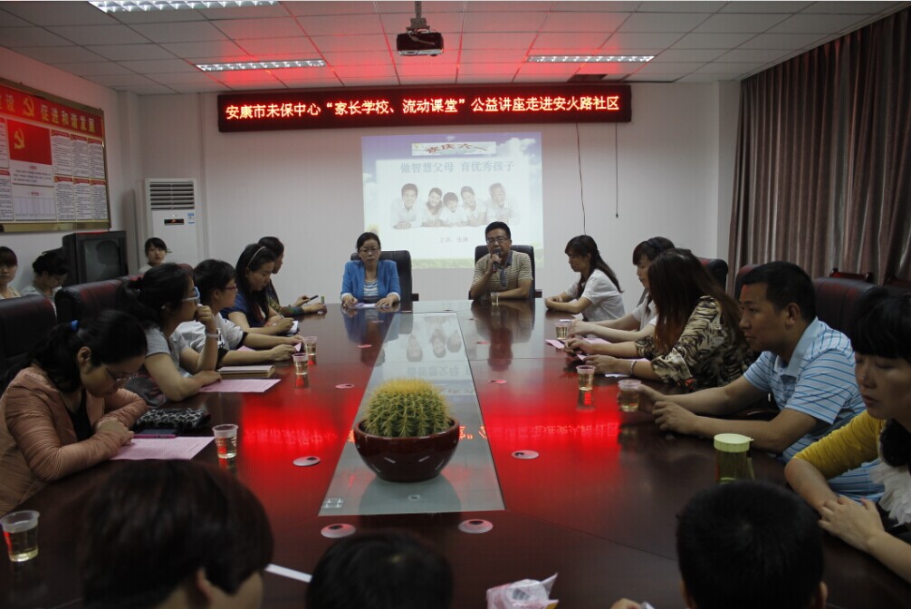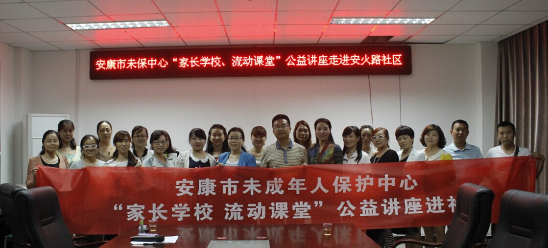 为庆祝六一儿童节,2015年5月29日晚上7点整, 安康市未成年人保护中心“家长学校 流动课堂”首场公益讲座联合安火路社区,在新城办安火路社区的会议室顺利展开。