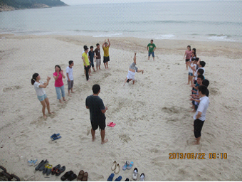 沙滩上,全体员工站成两排,玩从A点到B点走路心理游戏。每个人走四次,以各种方式从A点到达B点,走路姿势不准重复。虽然是在玩游戏,但其中各种感悟尽在玩乐当中。只要我们打开思路,开动脑筋,凡事都有三种以上的解决办法。游戏之路有不同的走法,人生之路亦如此,为了一个终极目标,我们的路该如何走,这是每个爸妈在线人应该思考的。